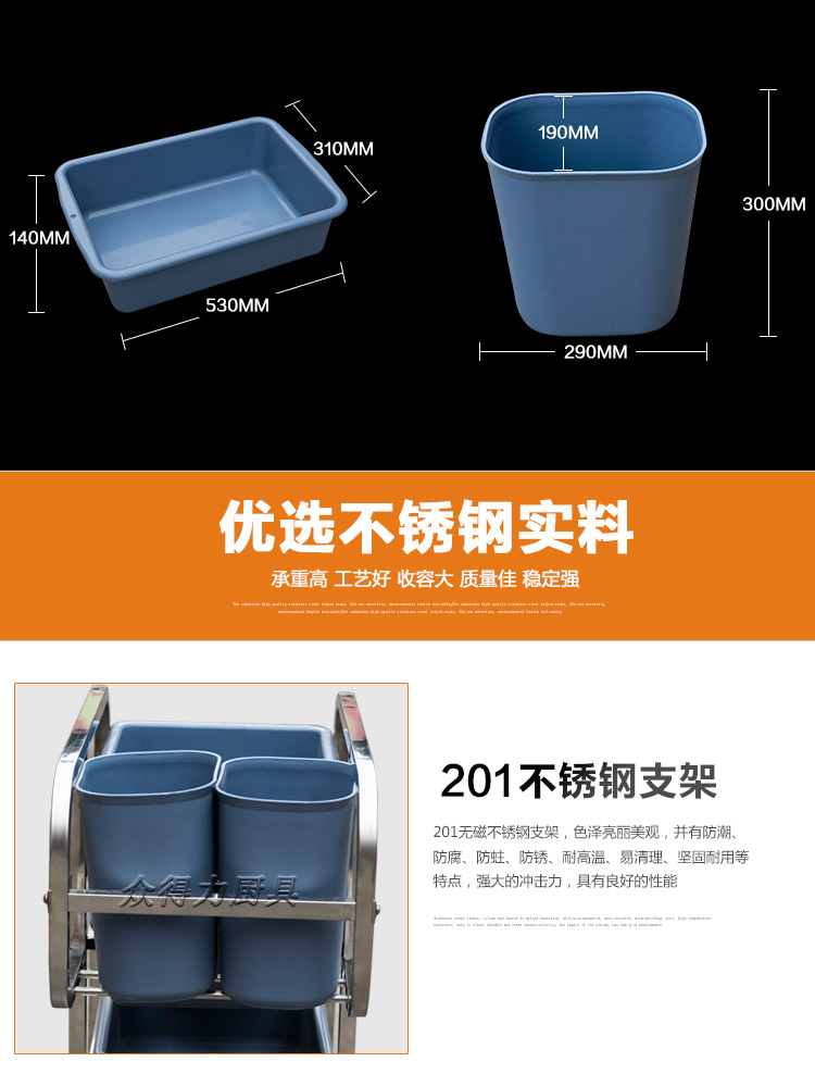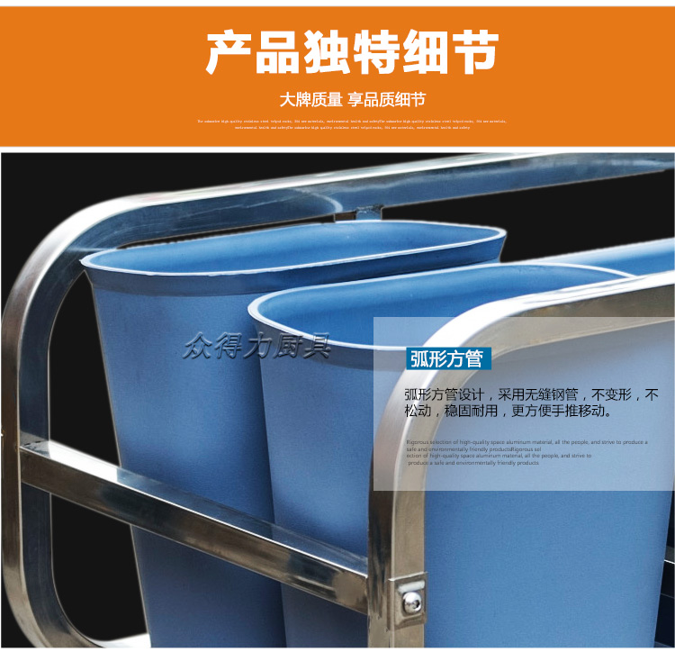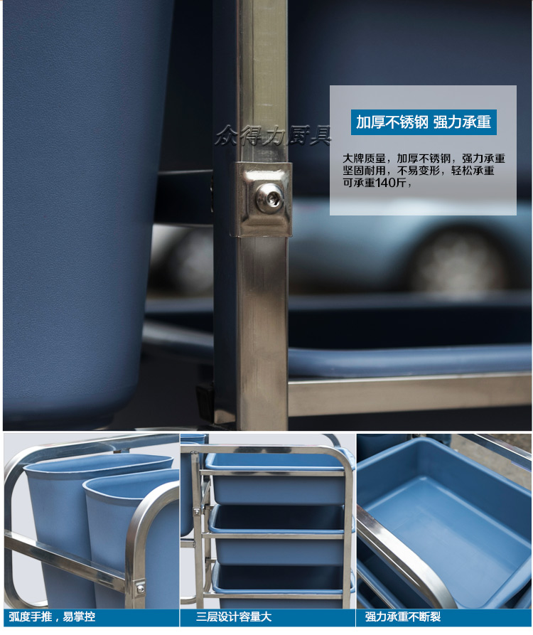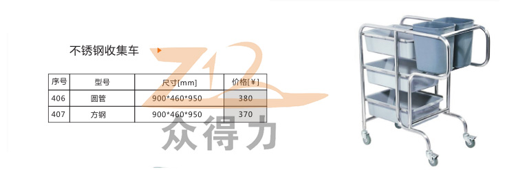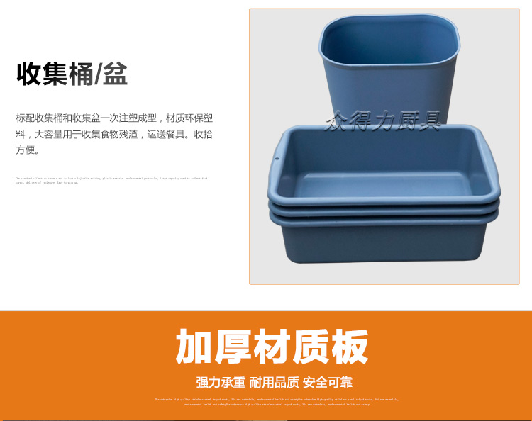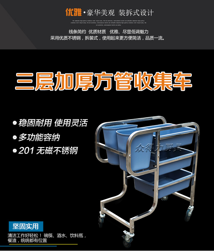 江西眾得力廚具有限公司生產(chǎn)銷(xiāo)售商用廚具,白鋼調(diào)理系列設(shè)備及食品機(jī)械,提供中央廚房工程項(xiàng)目整體解決方案。不銹鋼收集車(chē)有方管和圓管之分,組裝式,拆卸清洗方便,采用標(biāo)配足0.8mm201無(wú)磁不銹鋼加工設(shè)計(jì)。外形美觀,設(shè)計(jì)精量,符合餐飲食品衛(wèi)生需求。