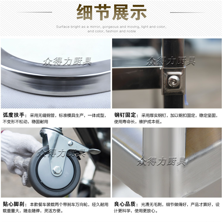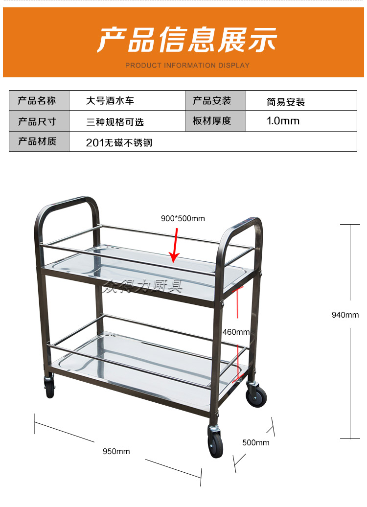 江西眾得力廚具有限公司生產(chǎn)銷(xiāo)售食品機(jī)械,商用廚具系列中央廚房設(shè)備,為客戶(hù)提供廚房整體解決方案。我司生產(chǎn)銷(xiāo)售的酒水車(chē)有大、中、小三種規(guī)格,采用201無(wú)磁不銹鋼設(shè)計(jì)。外形美觀大方,結(jié)實(shí)耐用。深受餐飲酒店客戶(hù)青睞