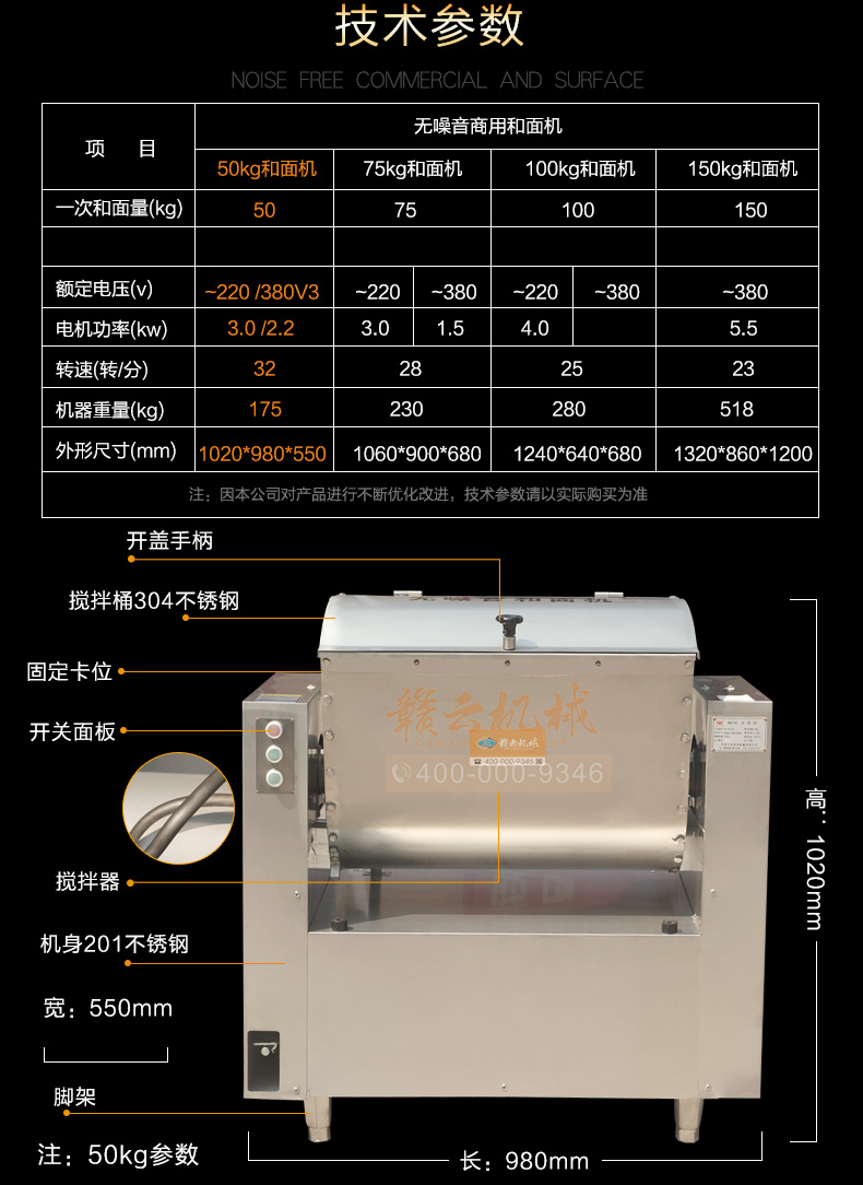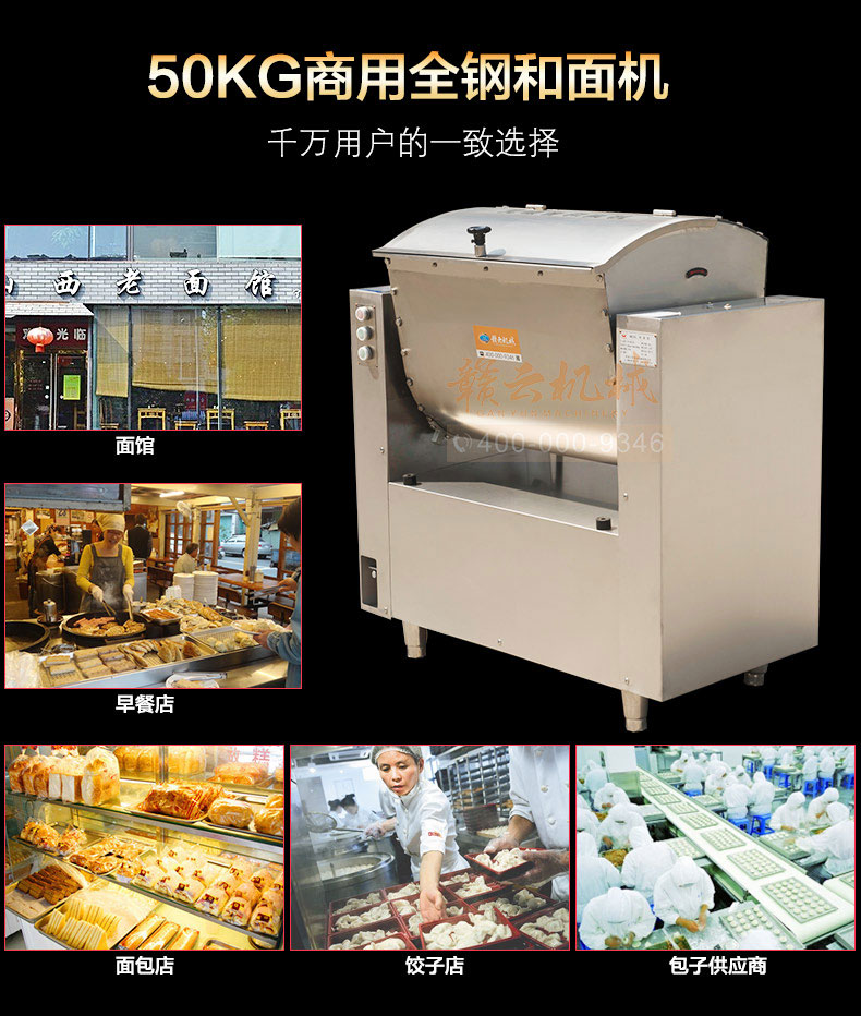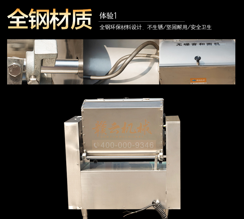 全鋼和面機(jī),工程系列50kg和面郎,整機(jī)外殼不銹鋼材質(zhì),絞龍和和面桶均為食品級(jí)不銹鋼,安全衛(wèi)生,適合中央廚房面點(diǎn)加工,面食加工廠生產(chǎn)和面攪拌之用。本系列產(chǎn)品有25kg和50kg兩種款式