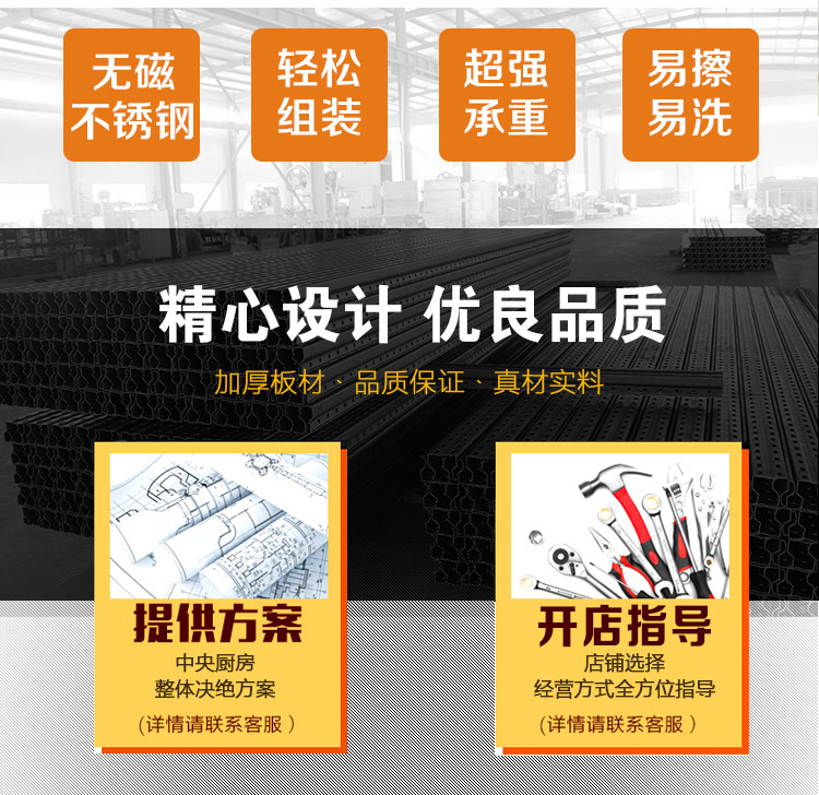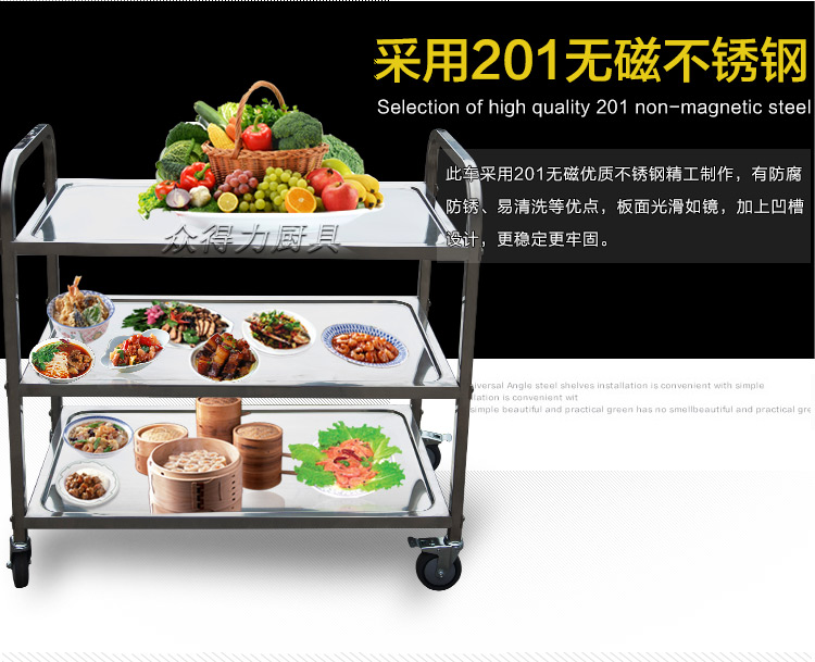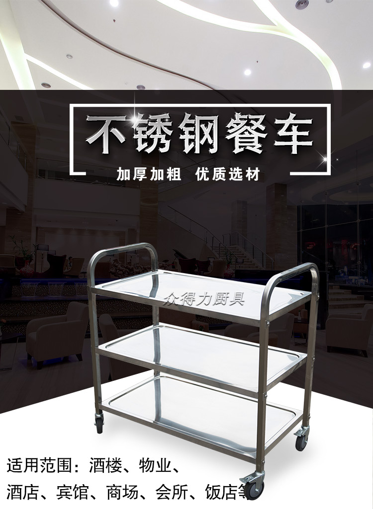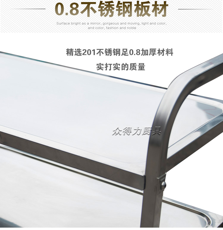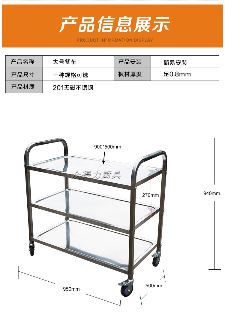 江西眾得力廚具有限公司生產(chǎn)銷(xiāo)售商用廚具,食品機(jī)械,提供中央廚房工程項(xiàng)目整體解決方案。不銹鋼餐車(chē)有大號(hào)、中號(hào)、小號(hào),本公司生產(chǎn)銷(xiāo)售的不銹鋼餐車(chē)系列均采用201無(wú)磁不銹鋼材質(zhì),板材厚度足0.8mm,整機(jī)拆裝方便,結(jié)構(gòu)牢固,承重能力強(qiáng)。