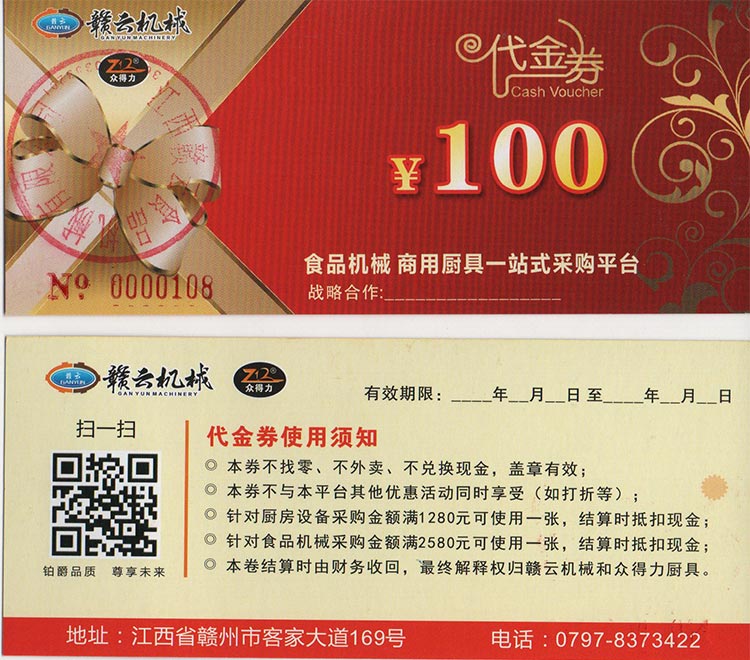我司聯(lián)合贛云機(jī)械發(fā)起廚具與食品機(jī)械聯(lián)合采購(gòu)抵扣卷,本次活動(dòng)真實(shí)有效,廚具類設(shè)備采購(gòu)滿1280元即可使用該卷抵扣現(xiàn)金100元,食品機(jī)械類設(shè)備采購(gòu)金額滿2580元即可抵扣現(xiàn)金100元。